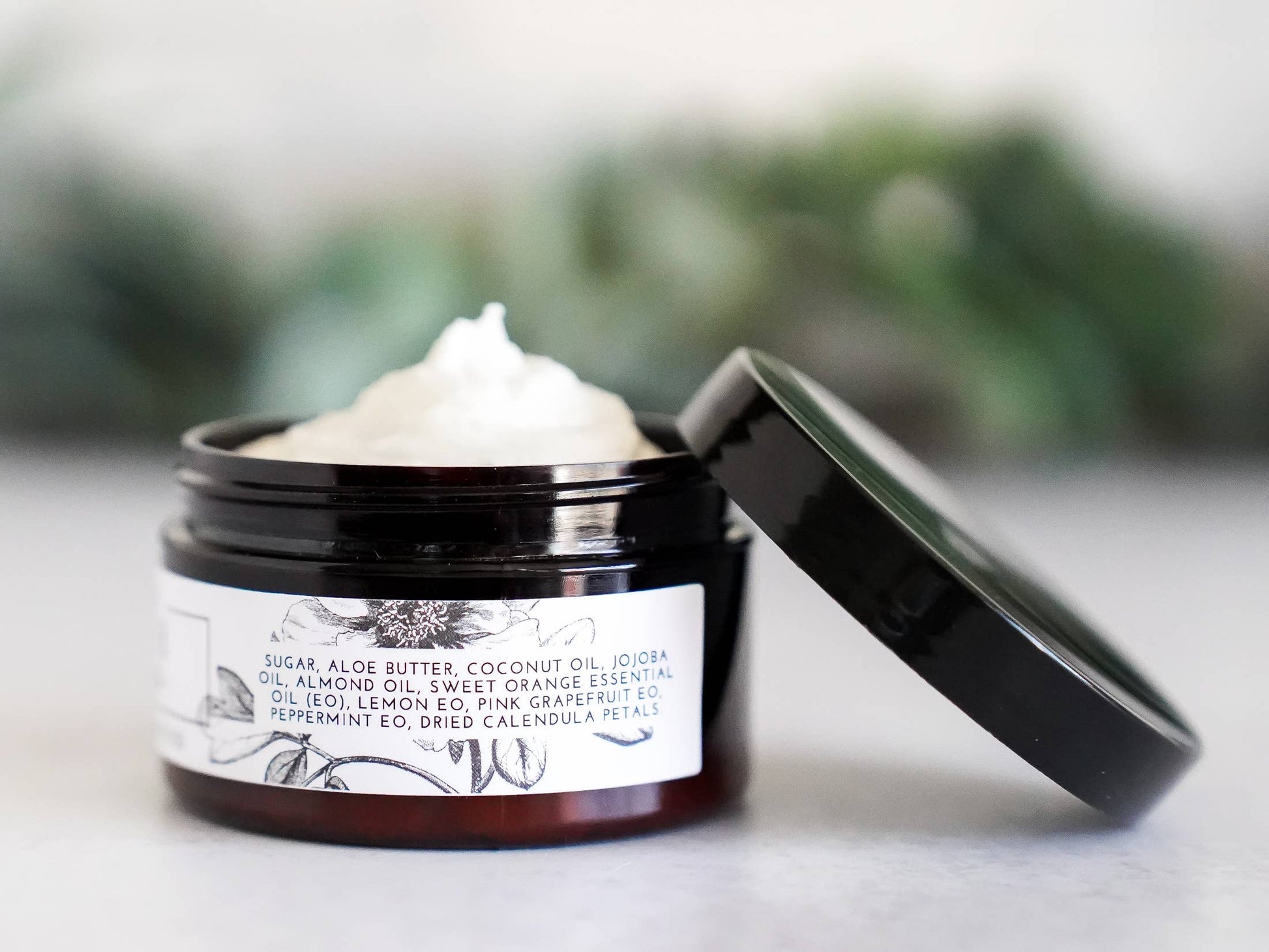 Ingredients: Sugar, Aloe Butter, Coconut Oil, Jojoba Oil, Almond Oil, Sweet Orange Essential Oil (EO), Lemon EO, Pink Grapefruit EO, Peppermint EO, Dried Calendula Petals.