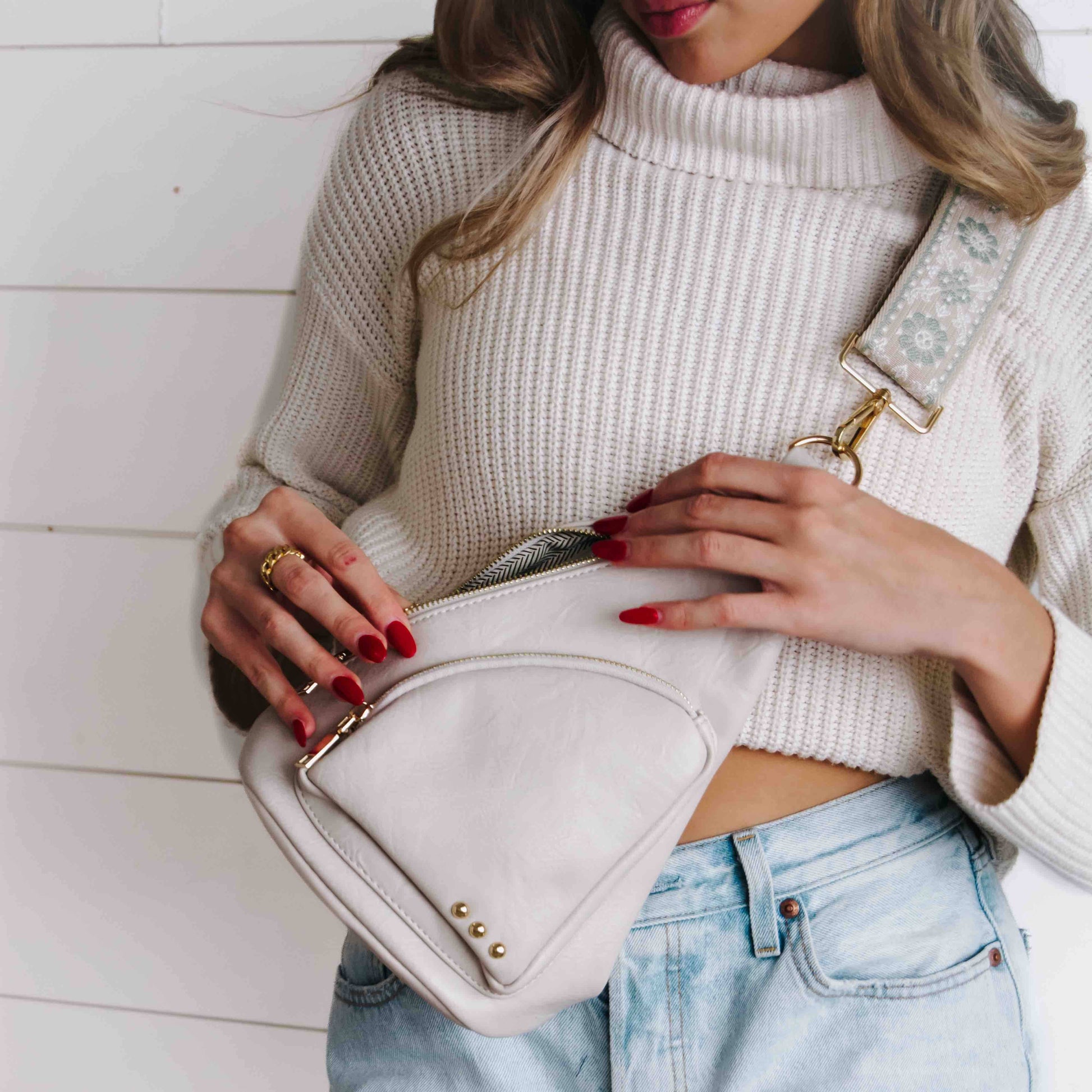 Meet our Austin Sling Bag! If you love our Jordan Sling Bag, you are going to love this style. This beauty has been added to our 3 Sisters Collection, and is the perfect bag to hold all your things. There is a small front pocket for your smaller easy to reach items such as keys, lipgloss, hair ties, etc. The large side pocket has a chevron pattern, and an additional slash zipper pocket. The Austin Sling Bag has a removable woven floral guitar strap, and is a great bag for many occasions. Measurements: 9.5"L x 4.5"W x 12"H Strap: 22.5" - 41.5" Material: Vegan Leather