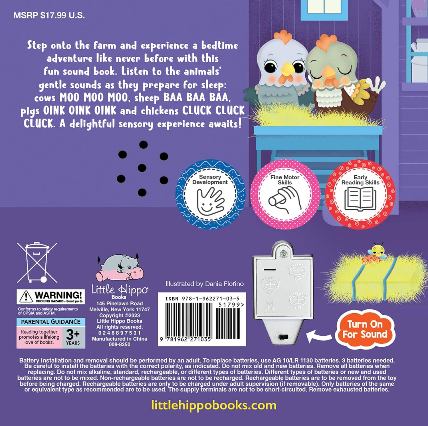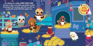 Step onto the farm and experience a bedtime adventure like never before with this fun sound book. Listen to the animals’ gentle sounds as they prepare for sleep: cows MOO MOO MOO, sheep BAA BAA BAA, pigs OINK OINK OINK and chickens CLUCK CLUCK CLUCK. A delightful sensory experience awaits! Children will love the colorful illustrations on each page as they listen to the story and play the sounds of the animals, and parents will enjoy seeing the smile on their little one’s face as they read it to them.