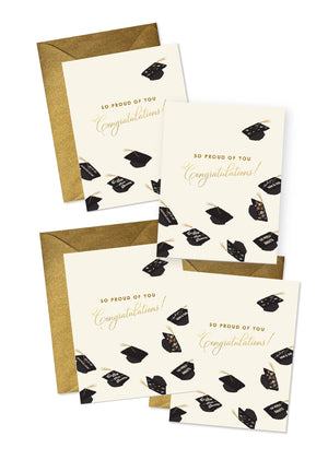 A flying hat celebration to congratulate the recent grad(s)! With gold foil accents. Boxed set of 8 folded cards and envelopes.