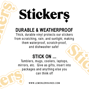Our stickers are waterproof, scratch-proof, and dishwasher safe! Stick on most anything... tumblers, mugs, coolers, laptops, mirrors, etc. Give as gifts, insert into packages and anything else you can think up!