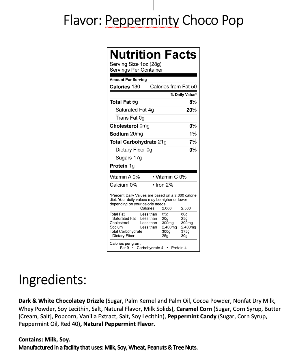 Get ready to embark on a tasty candy adventure that combines the timeless charm of rich, velvety chocolate with the refreshing zing of peppermint. Each Pepperminty Choco Pop is a mouthwatering masterpiece, starting with a core of air-popped popcorn that's bathed in a luscious layer of creamy milk chocolate. But it doesn't stop there! We take it to the next level by sprinkling it with the finest crushed peppermint candy canes, adding delightful c