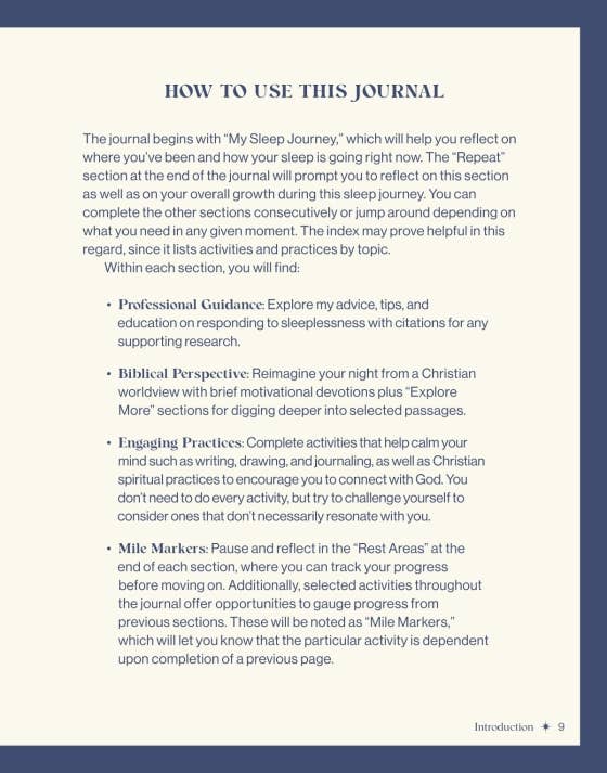 Organized according to the Sleepless Night Rules, Sleep Habits Journal will equip you with practical tools inspired by CBT-I to improve your sleep quality. Whatever your nights look like, may this guided journal invite you into experiencing more peace, rest, and comfort.