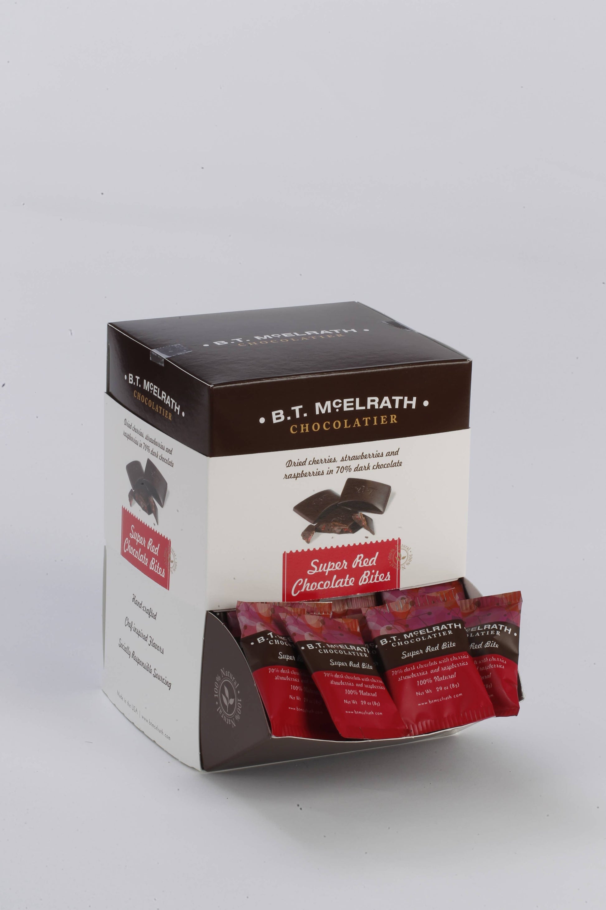 Roughly 90 of our individually wrapped Super Red Chocolate bites. Dried cherries, strawberries, and raspberries in our proprietary blend of 70% dark chocolate.