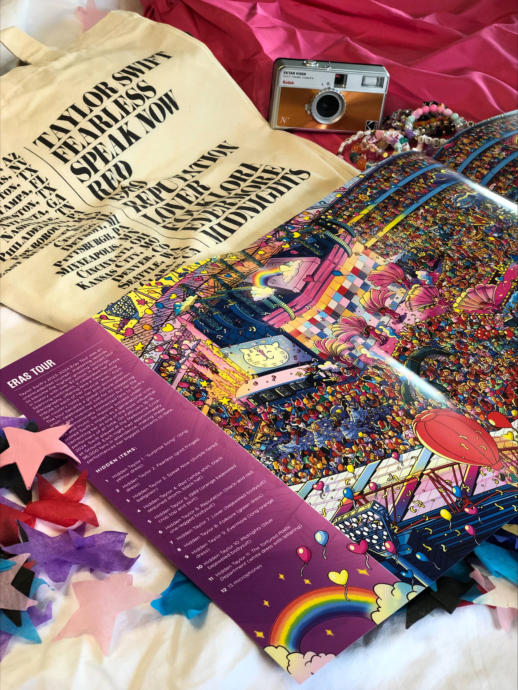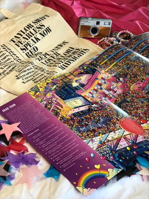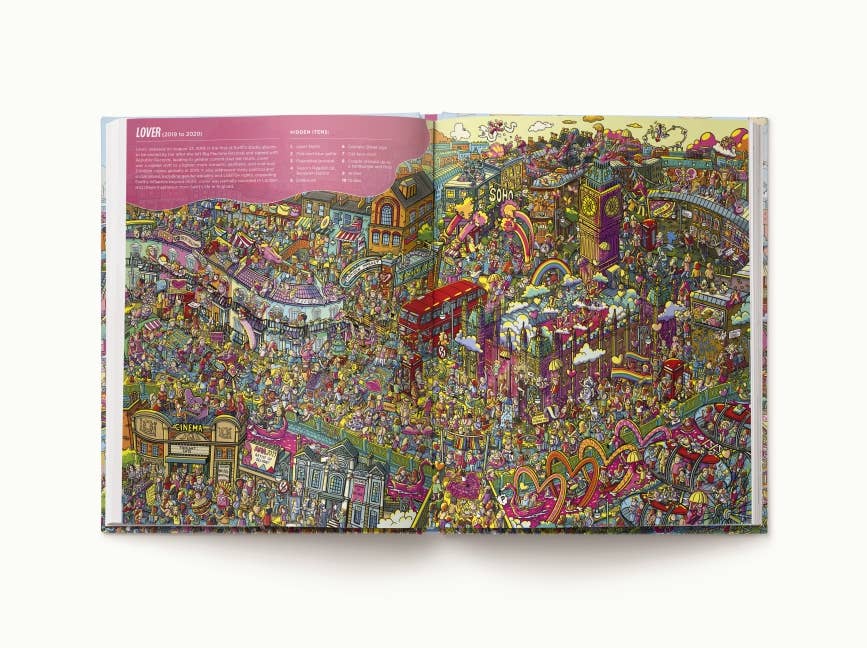 Dive into masterfully illustrated spreads, each inspired by a pivotal era in Taylor’s life. Seek her out in the snake-adorned chaos of Reputation, find hidden treasures among the glitter-dusted allure of 1989, and follow a trail of butterflies and rainbows through the dreamy world of Lover. Each page brims with secret details Swifties will instantly recognize—can you spot the “13”s or the infamous cardigan? Don’t forget to look for cameos from Meredith, Olivia, and Benjamin Button!