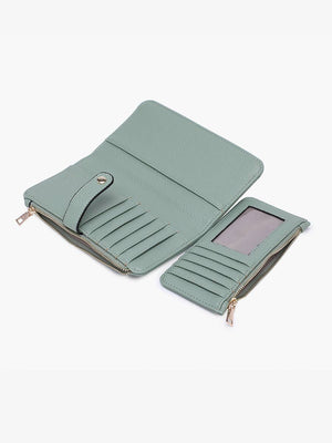-Features: Fold-out design with removable cardholder -Closure: Snap closure and top zipper pocket -Compartments: Fold-out interior and exterior zip pocket -Interior Pockets: Multiple card slots and slip pockets -Exterior Pockets: Front slip pocket with removable card slot wallet and zip pocket -Hardware: Gold-tone hardware -Material: Vegan leather Dimensions: -Length: 7.5 inches -Height: 4 inches
